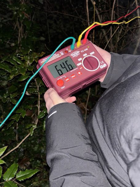 Für das setzen der Erdung haben wir Staberder verwendet. Beim setzen der ersten Erdung kamen wir auf einen Wert von ca 64Ω was deutlich zu hoch war. Weswegen wir noch einen zweiten gesetzt haben um auf einen Wert kleiner 30Ω zu kommen.